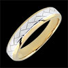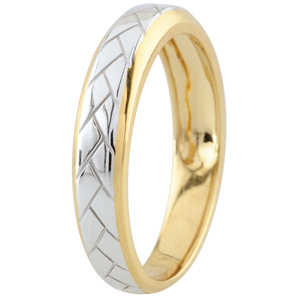 Un anello in Oro giallo dai bordi smussati, tessuto in Oro bianco nella parte centrale.