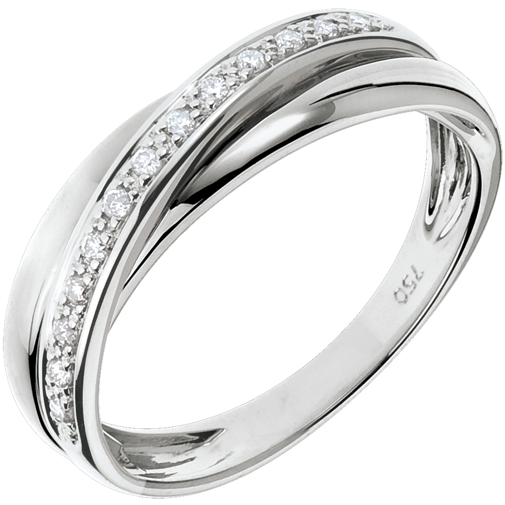 La fede equilibrata di 3 anelli, sottolineata da una lastricazione diamanti su oro bianco.