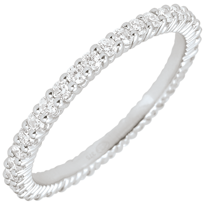 Questa esclusiva fede in Oro bianco è impreziosita su tutta la circonferenza da meravigliosi diamanti. Una fede nuziale dall'eleganza senza tempo, ideale da indossarsi sola o abbinata all'anello di fidanzamento.