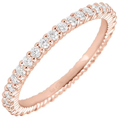 Questa esclusiva fede in Oro rosa è impreziosita su tutta la circonferenza da meravigliosi diamanti. Una fede nuziale dall'eleganza senza tempo, ideale da indossarsi sola o abbinata all'anello di fidanzamento.