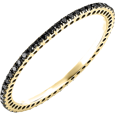 Un anello sottile e delicato in oro giallo costellato di diamanti neri lungo tutta la circonferenza. Una fede nuziale perfetta per essere indossata da sola o abbinata a un anello di fidanzamento.