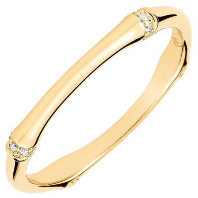 Un ramo di bambù solido e flessibile si trasforma in un anello d'oro giallo incastonato di diamanti dal fascino eterno.