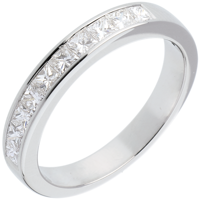 Un anello a sezione quadrata con pavè semi circolare, dal design semplice e raffinato. Diamanti taglio principessa incastonati a binario.