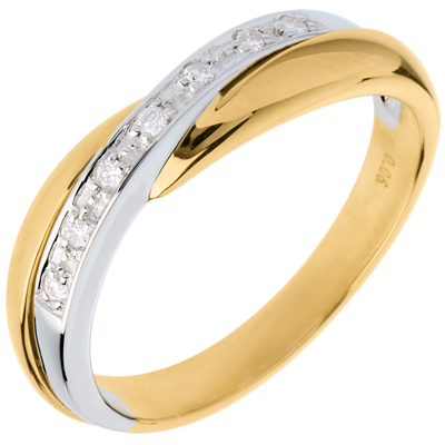 Una fede in Oro giallo abbracciata da un anello in Oro bianco semi pavé, per un gioiello armonioso ed elegante.