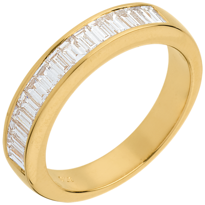 Un anello a sezione quadrata e pavé semi circolare, dal design semplice e raffinato. Diamanti taglio smeraldo incastonati a binario.