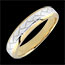 L’anello presenta bordi smussati in oro giallo e un intreccio centrale in oro bianco, simbolo di unione ed eleganza.