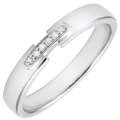 Un delicato anello in Oro bianco unito al centro da un dettaglio in Oro bianco incastonato di diamanti.br>6 Diamanti: 0.024 carati - Oro bianco (18 carati= 750/-): 3.57 g.