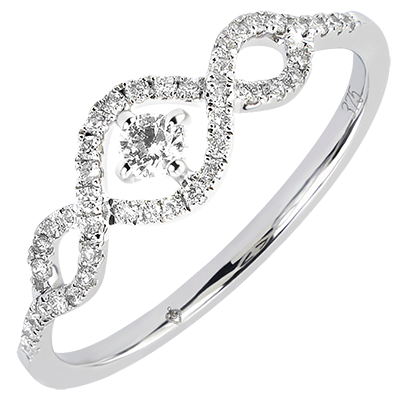Un diamante centrale circondato da volute di diamanti, per un modello intriso di femminilità e delicatezza.
