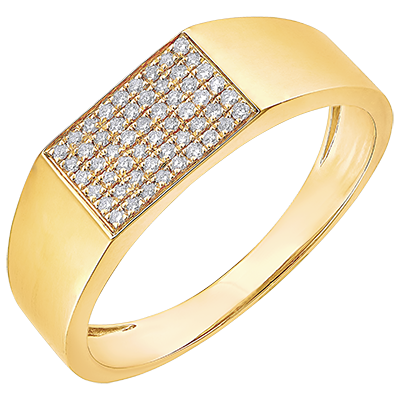 Una chevalière in oro giallo, il cui piano rettangolare è impreziosito da un generoso pavé di 54 diamants. Un gioiello allo stesso tempo delicato e spettacolare.