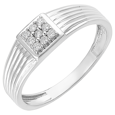 Una chevalière dal piano in oro bianco delicatamente zigrinato e il cui centro è impreziosito da un pavé di 9 diamanti.