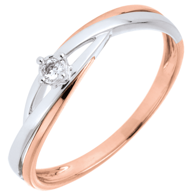 Questo gioiello unisce sapientemente la modernità dell’oro bianco al calore dell’oro rosa, per un duo di ori che esalta la luminosità del diamante.
