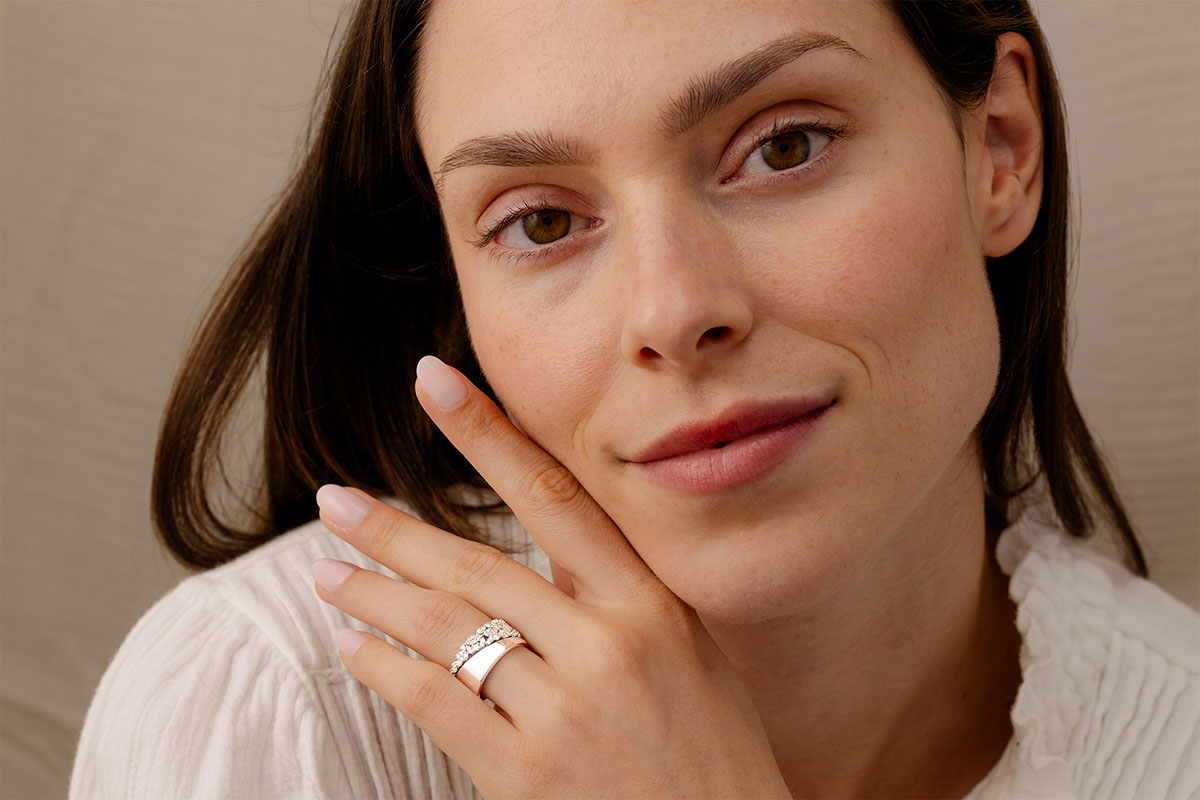 Una creazione di carattere che unisce preziosamente la sobrietà dell'oro lucido al pavé di diamanti.