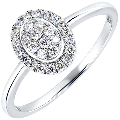 Lo splendore delicato di un pavé di diamanti ovale, contornato da una corona di diamanti. Un anello fine e sottile, intriso di dolcezza.