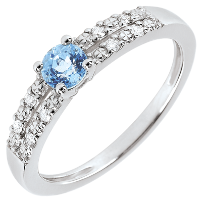 Su un anello in oro bianco incastonato di splendidi brillanti su due file, troneggia un topazio centrale. Purezza e semplicità per questo solitario accompagnato.