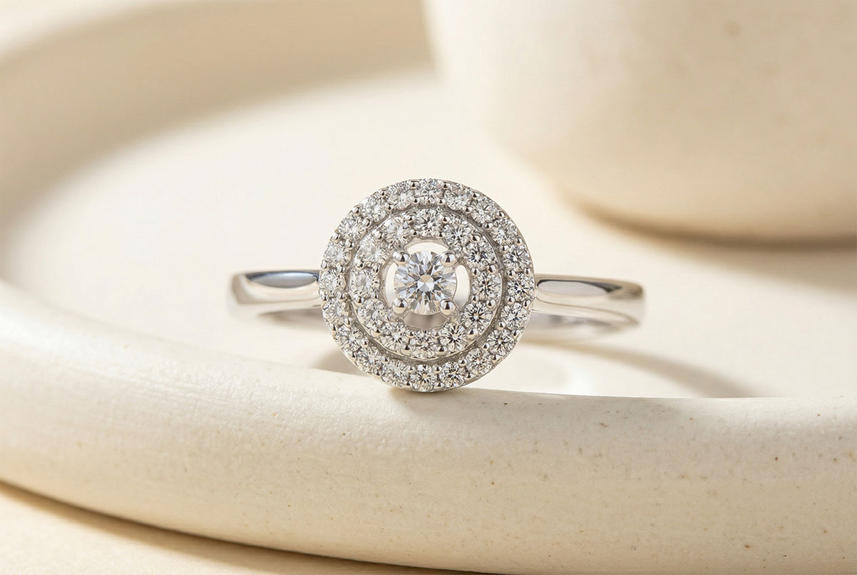 Un anello di fidanzamento di carattere, impreziosito da un diamante centrale con una doppia corona di diamanti. Una montatura raffinata dallo splendoroe abbagliante, quasi ipnotico.