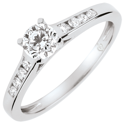 L'essenzialità di un solitario in oro bianco, esaltato da un corteo di brillanti. Una montatura delicata e senza tempo.