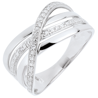 Una tripla fascia d'oro bianco incrociata da un'onda di diamanti.