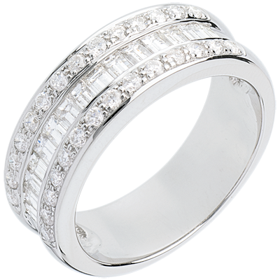 Un anello in Oro bianco a 3 file di diamanti, taglio rotondo e baguette, per una montatura abbagliante e speciale.