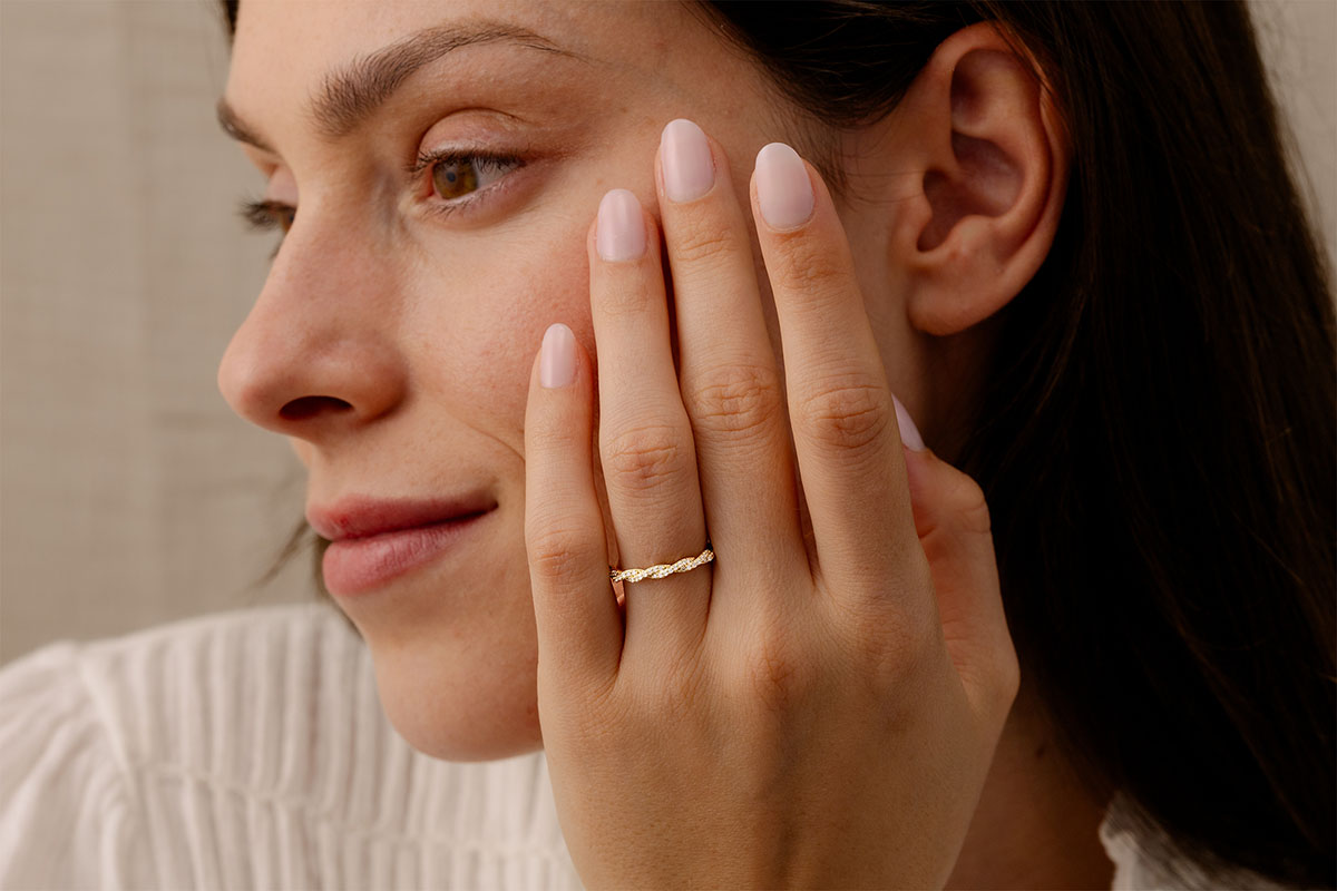 Un anello in cui due fili d'oro giallo con pavé di diamanti s'intrecciano in un abbraccio eterno.