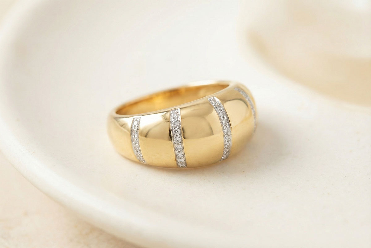 Un anello in Oro giallo dalle forme bombate è impreziosito da sottili linee pavé di diamanti. Un gioiello dall'eleganza discreta e raffinata.
