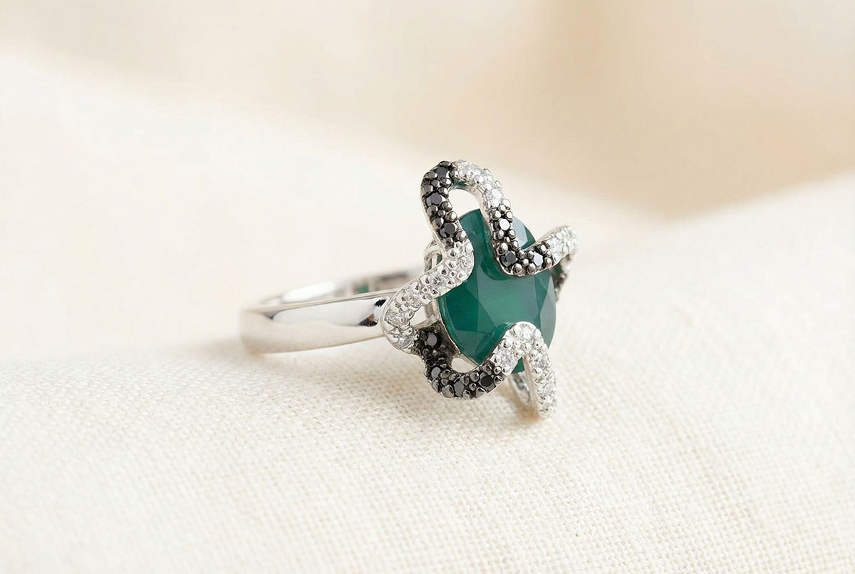 Affascinante, un'agata verde è sormontata da una serpentina di diamanti neri e bianchi.