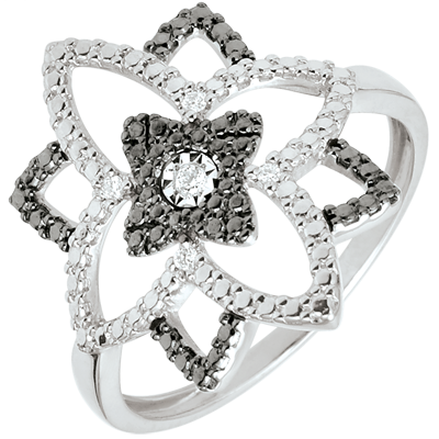 Un anello a fiore in Oro bianco dai petali leggeri lavorati a diamante. L'alternanza di nero e bianco esalta questo gioiello originale.