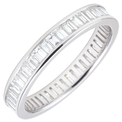 L'equilibrio perfetto di un anello in Oro bianco pavé con 50 diamanti baguette incastonati a binario. Un gioiello indispensabile per un legame speciale.