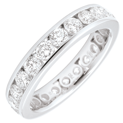 L'equilibrio perfetto di un anello in oro bianco pavé di 23 diamanti rotondi incastonati a rotaia per un simbolismo forte. Un gioiello indispensabile per un legame d'eccezione.