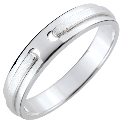 Due linee d'oro bianco spazzolato sono unite come una promessa d'eternità in un anello brillante. Una fede nuziale contemporaneamente classica ed unica, ideale per celebrare il vostro matrimonio.
