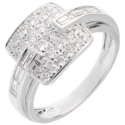 Un anello costellato di brilantezza, su una montatura in Oro bianco e diamanti baguette.