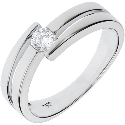 Degli anelli in Oro bianco incorniciano un diamante solitario con perfetta simmetria.