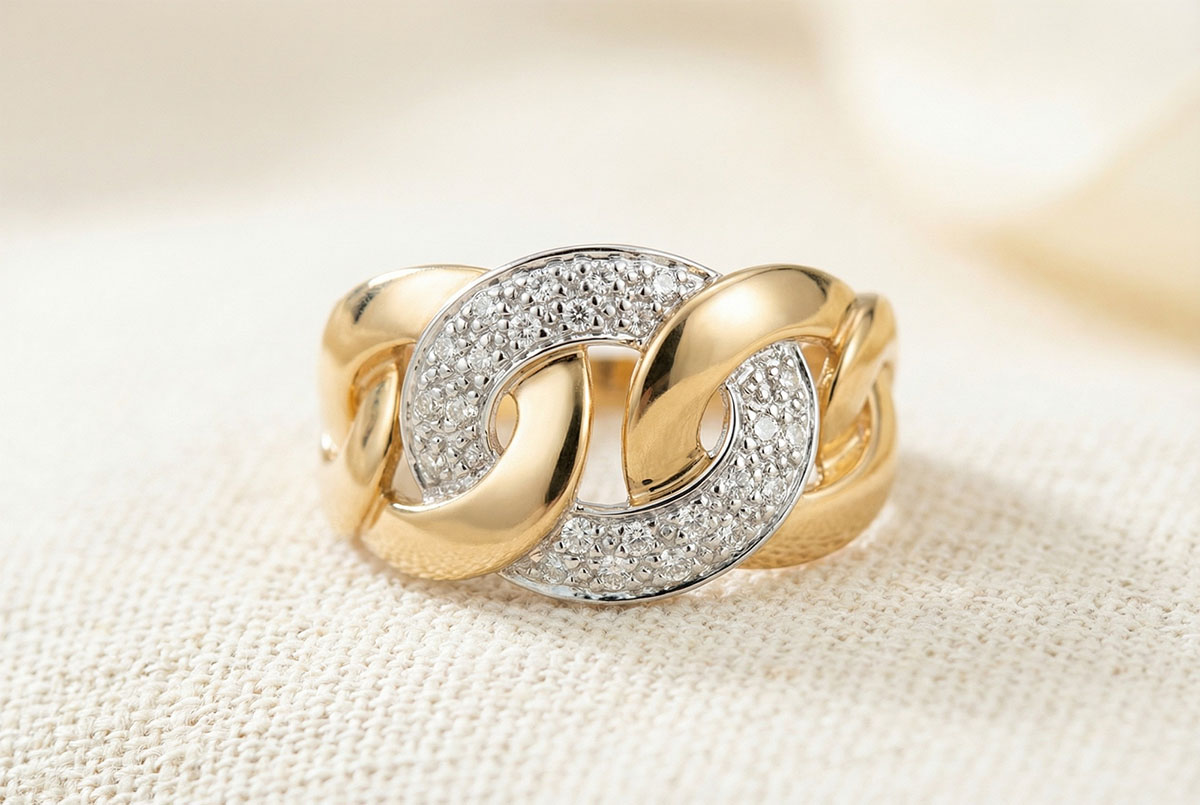 Un anello originale e prezioso che replica la maglia a catena di una collana.