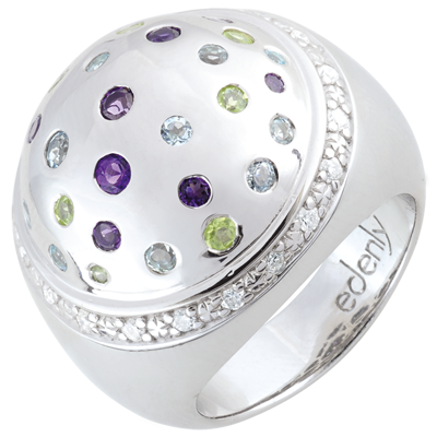 Una semisfera con pietre dure contornata di diamanti. Un gioiello moderno e luminoso, impreziosito da ametiste viola, topazi azzurri e peridoti.