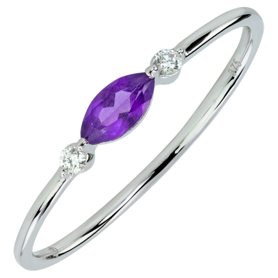 La preziosa pupilla simboleggiata da una navetta di ametista troneggia al centro di questa sottile montatura in filo d'oro bianco. È circondata da due sublimi diamanti, come due lacrime cristallizzate per sempre.