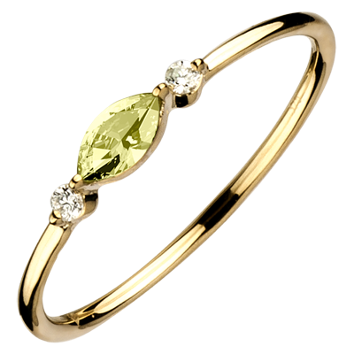 La preziosa pupilla simboleggiata da una navetta di peridoto troneggia al centro di questa sottile montatura in filo d'oro giallo. È circondata da due sublimi diamanti come due lacrime cristallizzate per sempre.