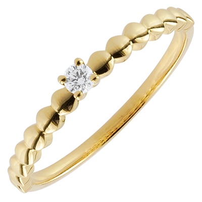 Una montatura formata da piccole caramelle in Oro giallo sublima un diamante solitario. Un anello di fidanzamento originale e femminile.