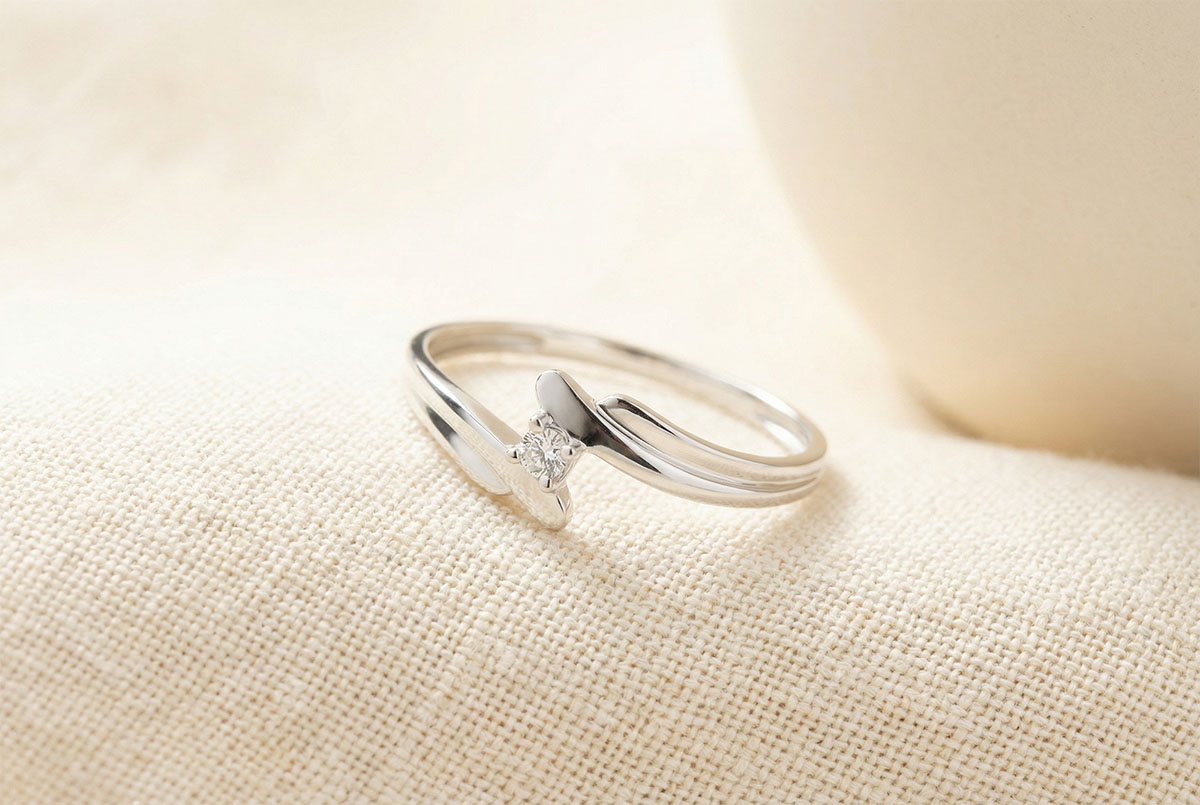 Un diamante stretto in una graziosa montatura d'Oro bianco ad ali di cigno.