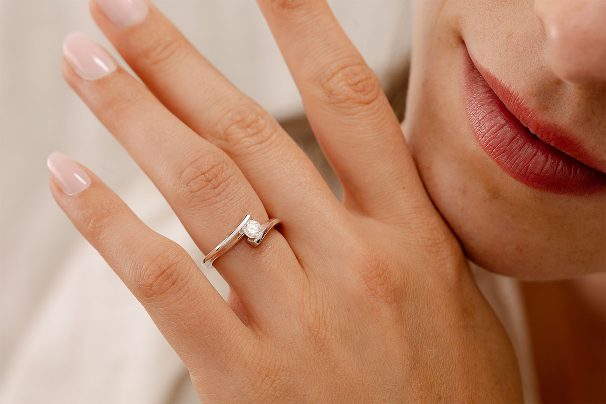 Un anello scintillante e sobrio grazie a una montatura sinuosa in Oro bianco che esalta un diamante solitario.