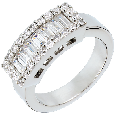 Una montatura di carattere impreziosita da un pavé di diamanti baguette, per un anello molto speciale.