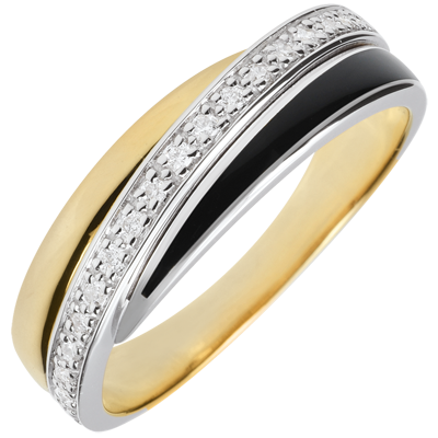 Un trio di lacca nera, diamanti e Oro giallo per un anello moderno e dal fascino senza tempo.