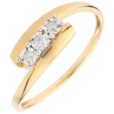 Un movimento sinuoso in Oro giallo è lo scrigno per una trilogia di diamanti delicatamente cerchiati d'Oro bianco cesellato.
