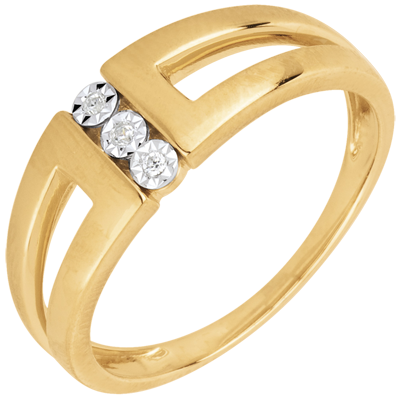 Una trilogia di diamanti tra le le linee parallele di una montatura in Oro giallo molto moderna.