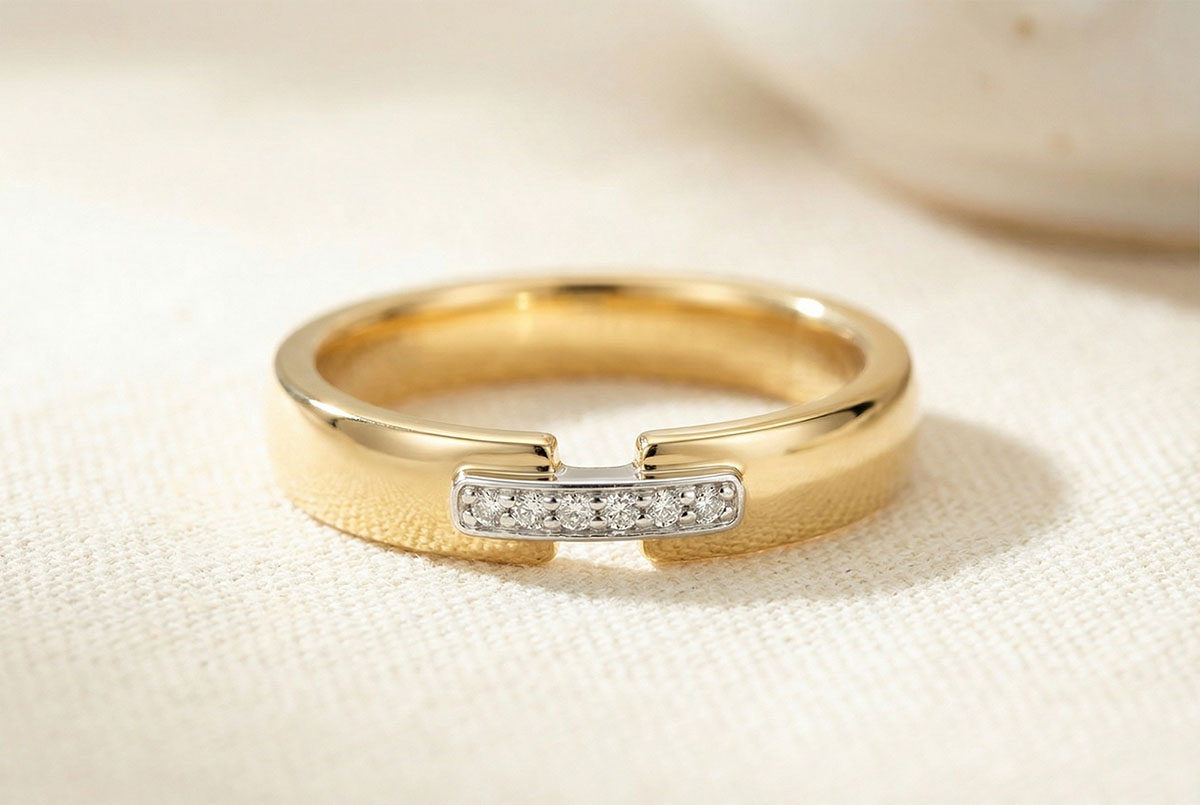 Un delicato anello in Oro giallo unito al centro da un dettaglio in Oro bianco incastonato di diamanti