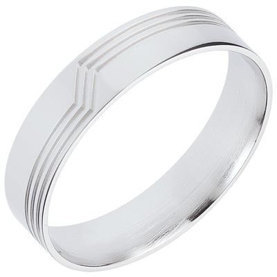 Un anello essenziale in Oro bianco, con inciso un motivo dal tocco geometrico.