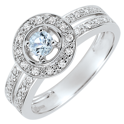 L'aquamarina centrale è valorizzata con eleganza da uno scrigno di brillanti. Un doppio anello incastonato di diamanti è la base che esalta con brio lo splendore di questo gioiello di fidanzamento in oro bianco.