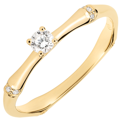 Un ramo di bambù solido e flessibile si trasforma in un anello di fidanzamento in oro giallo dal fascino eterno. I nodi del bambù incrostati di diamanti sublimano il prezioso diamante solitario.