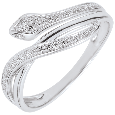Questo anello serpente d'oro bianco dalle forme sinuose ed affascinanti è adornato di diamanti neri per un aspetto elegante e moderno.