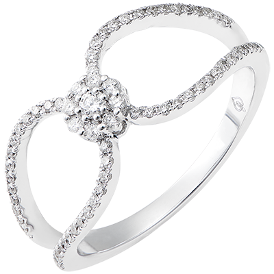 Une montatura delicata e tondeggiante in cui splende al centro un fiore di diamante. Un anello prezioso pieno di leggerezza.