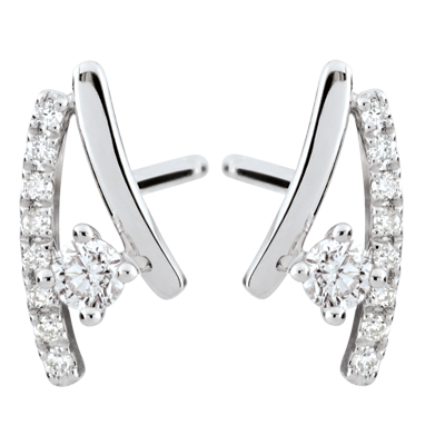 Due preziosi motivi in Oro e diamanti custodiscono un prezioso diamante bianco. Una coppia di orecchini elegante e originale, perfetta in ogni momento della giornata.