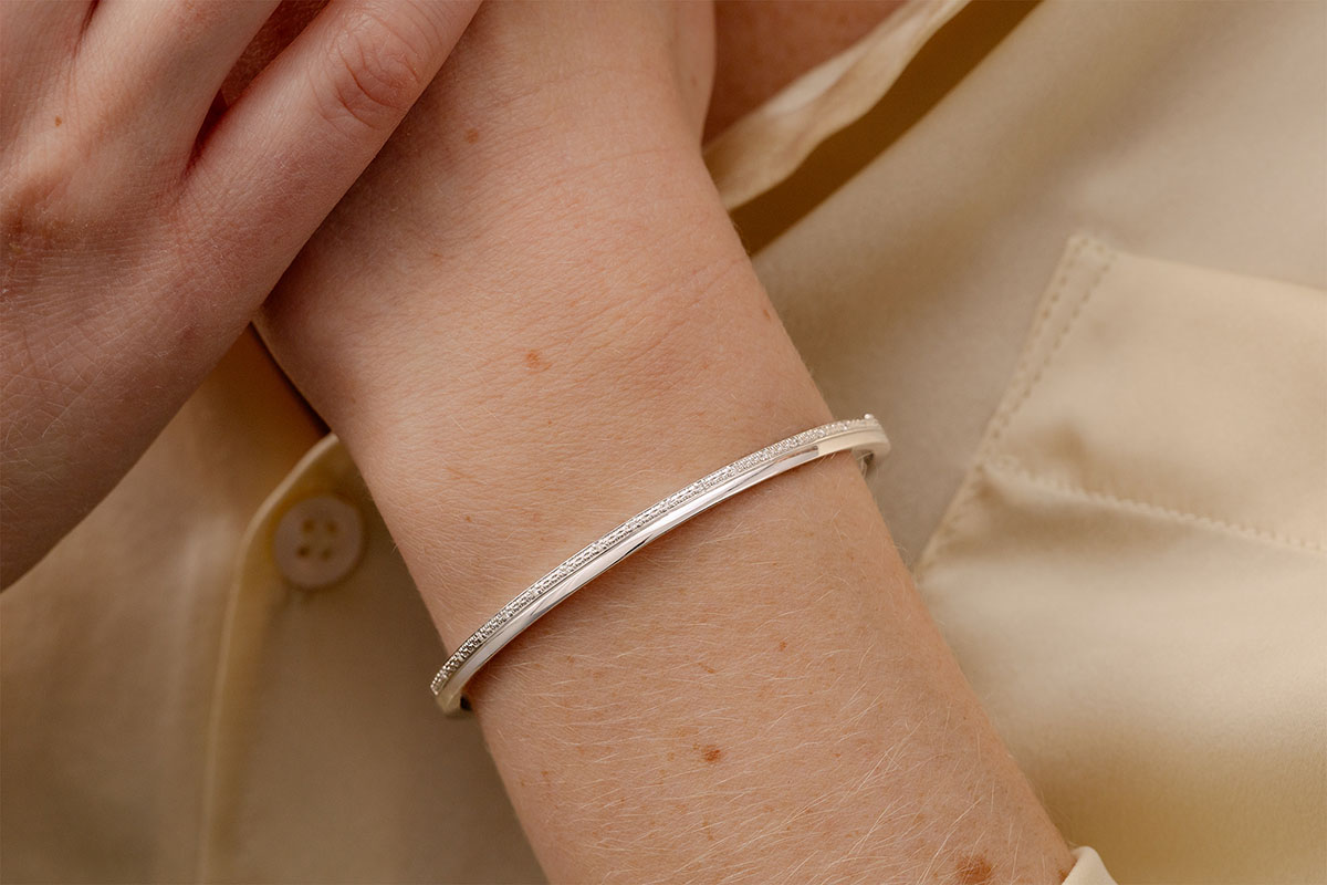 Un bracciale rigido elegante e femminile in oro bianco, sublimato dalla brillantezza del diamante.